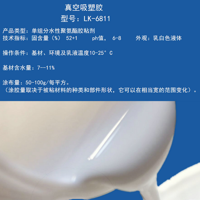 PVC水性真空吸塑胶水是一种水基型、单组分、无游离异氰酸酯单体的热塑性聚氨酯胶粘剂。具有无毒、不燃、安全、无异味、无刺激性、无甲醛等有害气体释放,是一种环保型水性胶粘剂。适用于聚氯乙烯(PVC)等软体热塑薄膜和密度板,刨花板,木材等的真空吸塑成型,也可用于免漆门,橱柜,音箱板,电脑桌等的贴合。