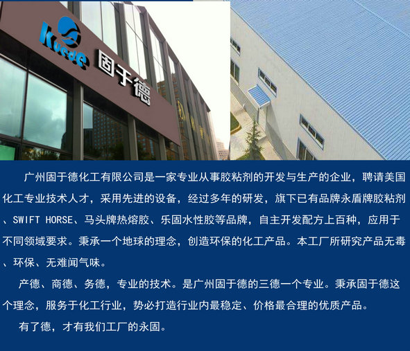 广州固于德化工有限公司是一家专业从事胶粘剂的开发与生产的企业,聘请美国化工专业技术人才,采用先进的设备,经过多年的研发,旗下已有品牌永盾胶粘剂、乐固木工水性胶、马头封边热熔胶等品牌,秉承一个地球的理念,创造环保的化工产品。本工厂所研究产品无毒、环保、无难闻气味。